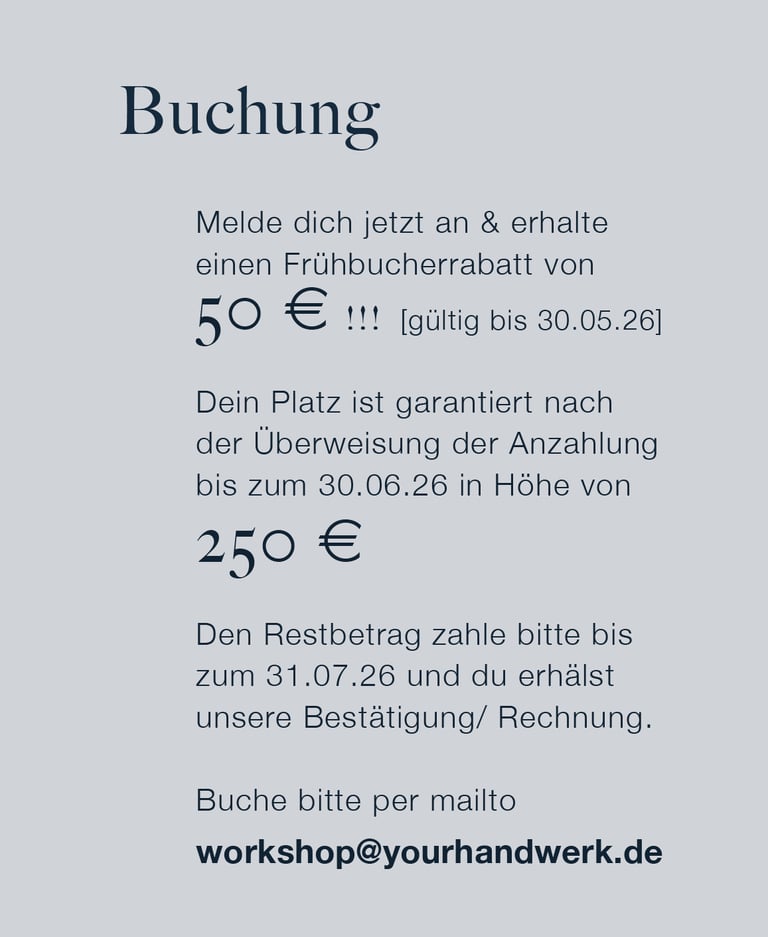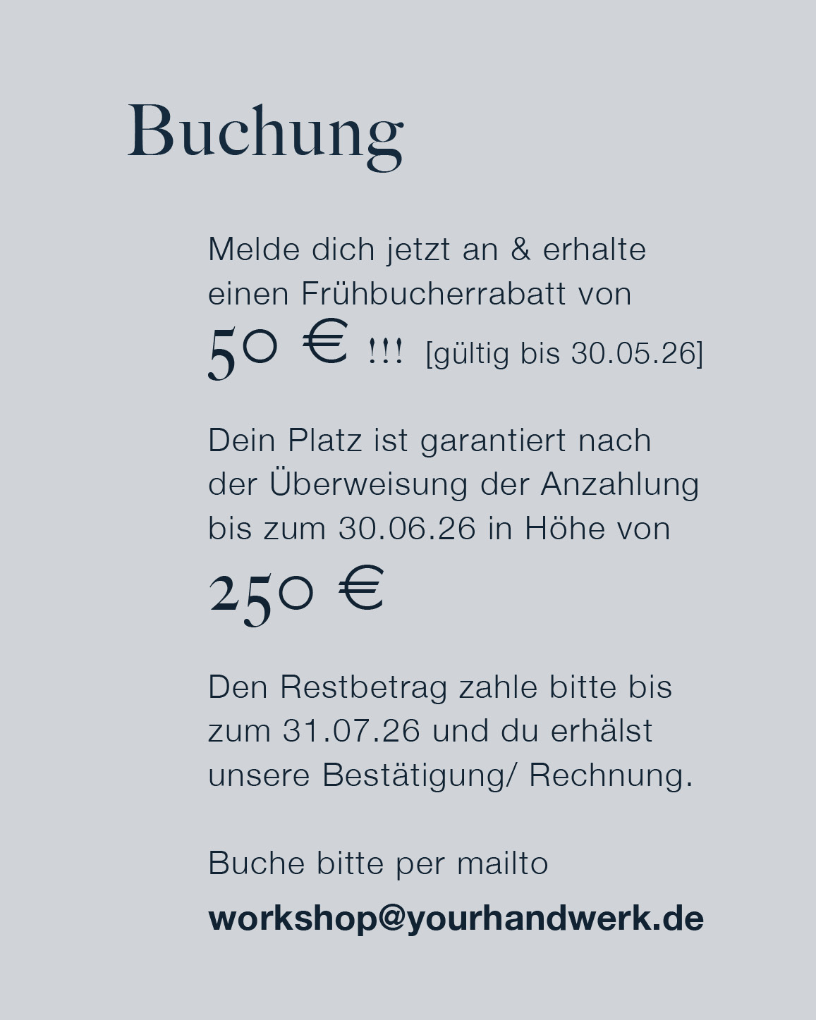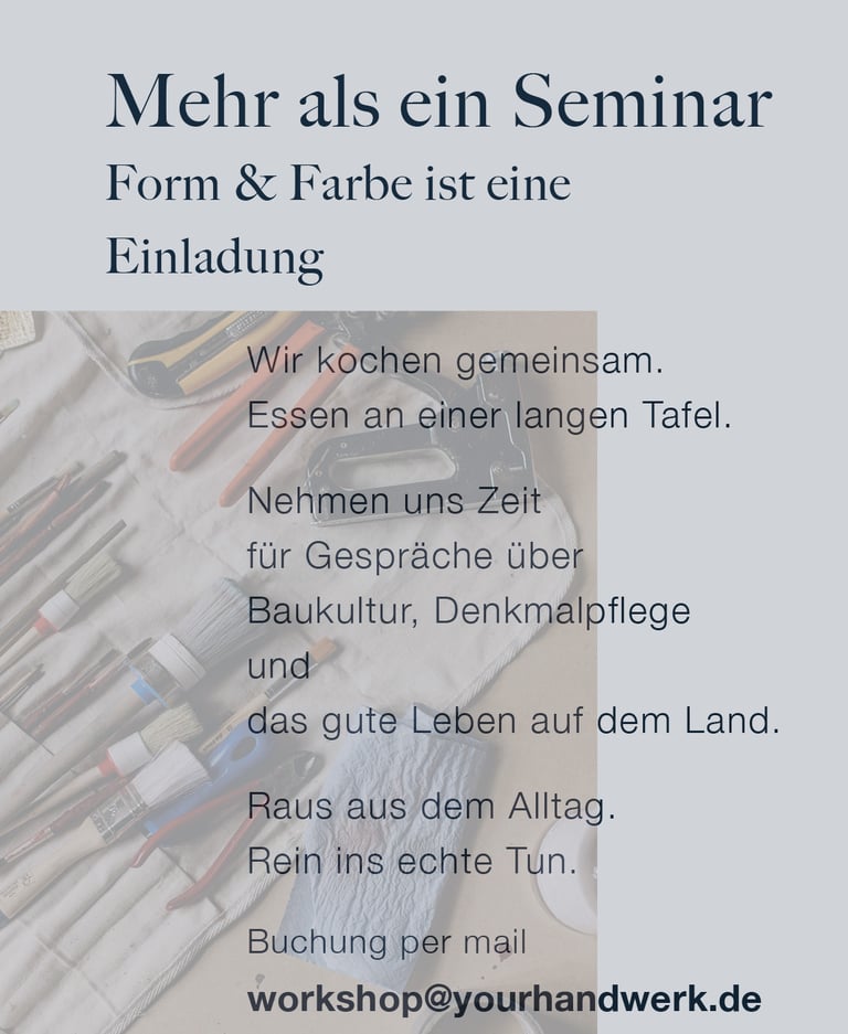 Wir sehnen uns nach gut gemachten Dingen, Architekturen, Essen, Landschaften ... und daher holen wir traditionelles Handwerk zurück ins Hier und Jetzt. Es steht für Werte, die uns Freude bereiten - beim Anschauen, Anfassen, Riechen und Schmecken. Handwerk kann berühren und inspirieren. Wir erleben eine tiefe Zufriedenheit durch das eigene Schaffen und praktische Tun - es ist dieser unmittelbare Bezug zur Arbeit, der uns erfüllt und verbindet.