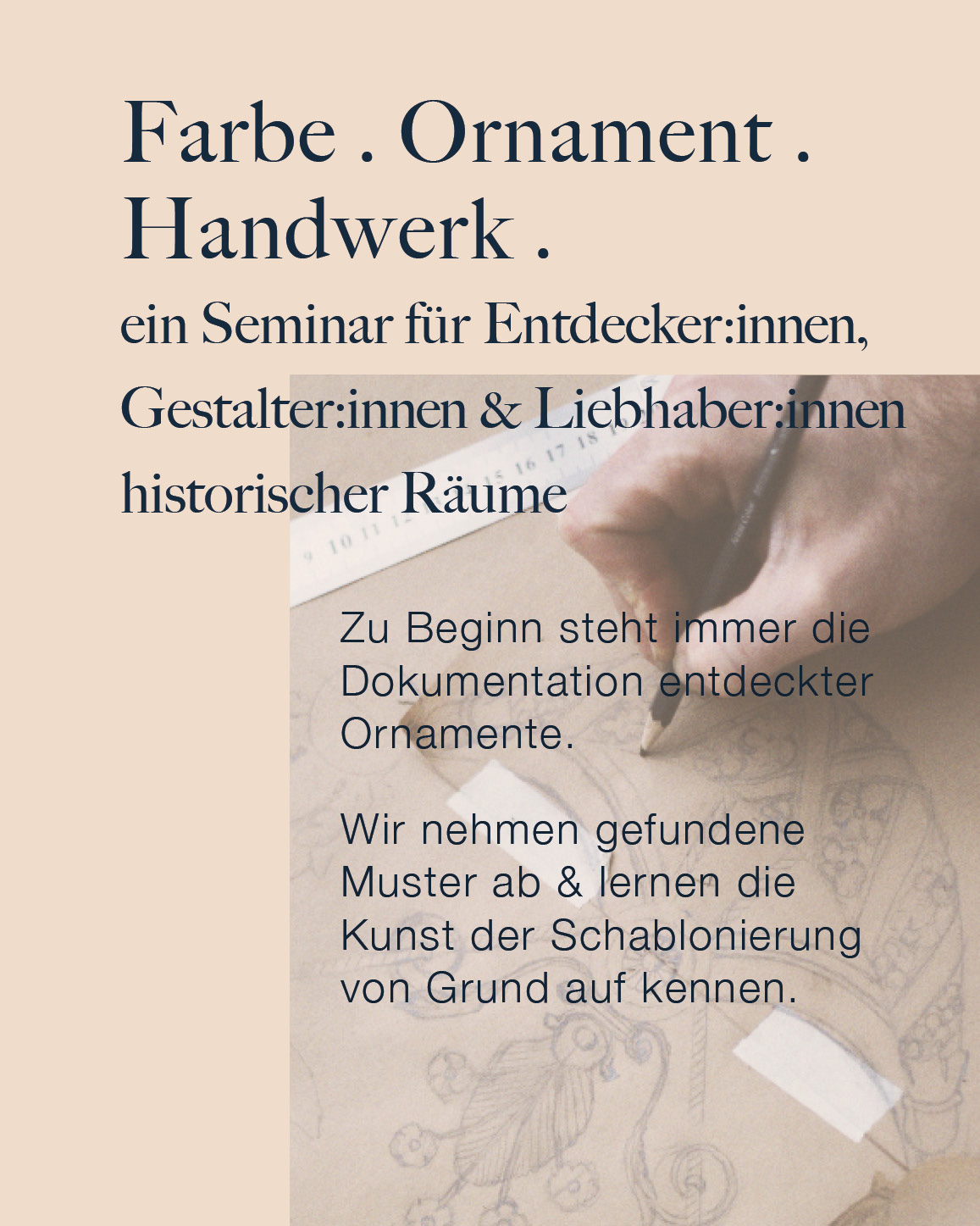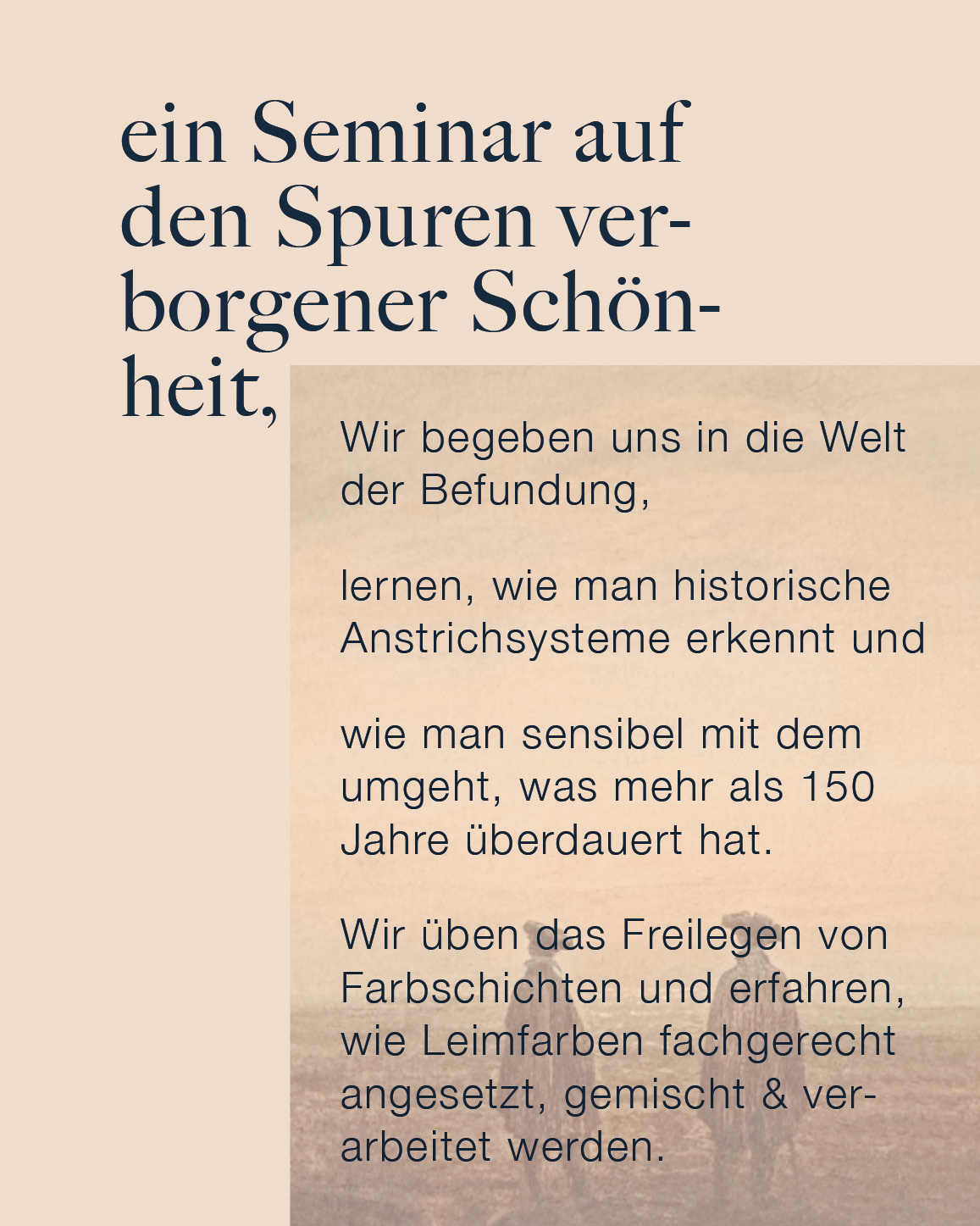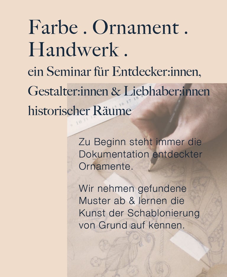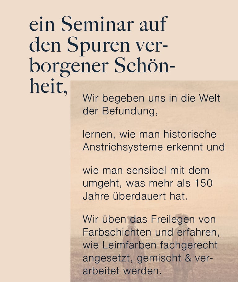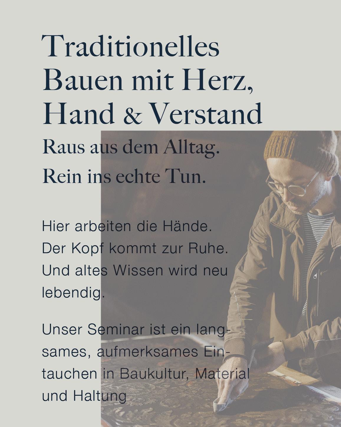 Unsere Seminare haben unterschiedliche Themenschwerpunkte. Einige beschäftigen sich mit Stein- und Erzeugnissen der Erde, andere mit Holzelementen und wiederandere mit Farben und Deckenmalereien. Expert:innen begleiten die Seminare und teilen ihr umfangreiches Wissen. Der Seminarort selbst, errichtet aus Stein und Holz, bietet zahlreiche Anschauungsbeispiele für traditionelle Techniken und Materialien, die zum langen Bestand des Gebäudes beitragen. Das Gutshaus dient sozusagen als "lebender Patient" bzw. als Lehrstück, dementsprechend zeigen wir wie sich tradierte Handwerkstechniken in die heutige Zeit transferieren lassen: "aus der Vergangenheit für die Zukunft lernen"